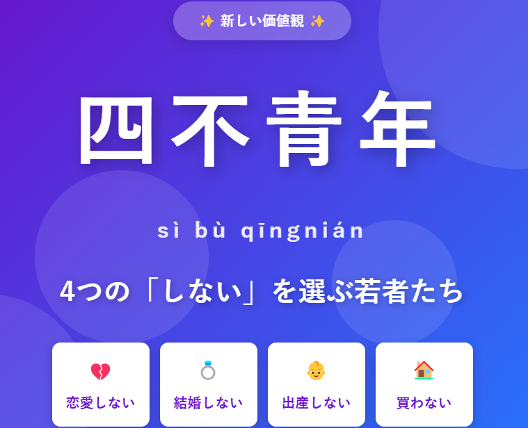 「四不」は**「4つの〜しない」、「青年」は「若者」**つまり、従来の価値観にとらわれない、新しい生き方を選ぶ若者たちを指します。
